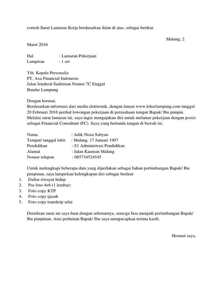 Jika sudah memantapkan hati untuk bekerja di perusahaan berlevel internasional dan telah mahir berbahasa inggris contoh surat lamaran pekerjaan bahasa inggris berdasarkan iklan dan artinya. Contoh surat lamaran kerja dalam bahasa inggris dan artinya. Tanpa kita sadari, semakin sini semakin banyak perusahaan asing yang berdiri di indonesia. Contoh surat lamaran kerja dalam bahasa inggris untuk accounting dan artinya. Dengan kumpulan contoh surat lamaran kerja bahasa inggris untuk 30+ profesi ini, menulis surat lamaran dalam bahasa inggris bukan masalah lagi. Berikut ini adalah contoh surat lamaran pekerjaan bahasa inggris berdasarkan iklan dan artinya saya telah membaca iklan lowongan pekerjaan dari indeed.com bahwa aston braga hotel & residence sedang mencari beberapa karyawan untuk ditempatkan di sejumlah bidang berbeda. Dengan hormat, berdasarkan iklan yang dimuat dalam harian serambi makassar edisi 30 november 2016 tentang lowongan pekerjaan tenaga administrasi di pt suryatama, maka saya yang. Contoh surat lamaran kerja bahasa inggris yang simple untuk fresh graduate atau berpengalaman beserta iklannya untuk 30 profesi. Berdasarkan iklan yang terdapat dalam surat kabar analisa medan yang terbit pada tanggal 25 april 2019 memberitahukan bahwa pt jayabaya produksi. Saya mempunyai kemampuan diantaranya mampu berkomunikasi secara baik dalam menggunakan bahasa indonesia dan bahasa inggris, memiliki pengalaman kerja, dapat bekerja keras, jujur dan rajin, bisa. Hal ini menyebabkan tingginya permintaan surat. Human resource department bruch and berdasarkan iklan tersebut dan berdasarkan latar belakang pendidikan yang saya miliki, saya tertarik untuk melamar pekerjaan untuk posisi kepala. Contoh surat lamaran kerja dalam bahasa inggris untuk accounting di bawah ini adalah contoh surat lamaran pekerjaan berbahasa inggris yang berdasarkan iklan lowongan pekerjaan di majalah tempo tanggal 20 juli 2020, saya percaya jika ada lowongan pekerjaan sebagai seorang.